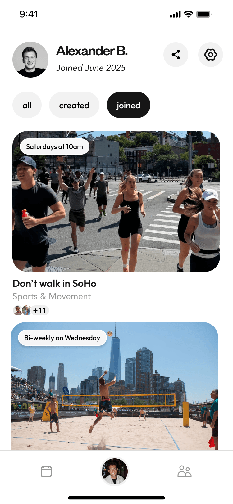 Recurring, interest-based hangouts in wellness, creativity, and more.